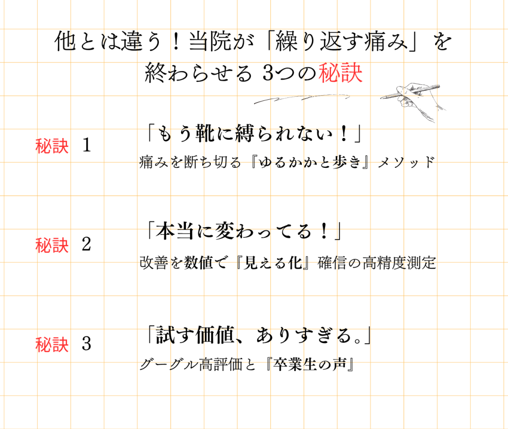「長年の足の悩みを繰り返さなくなる」明確な道筋を提示します。